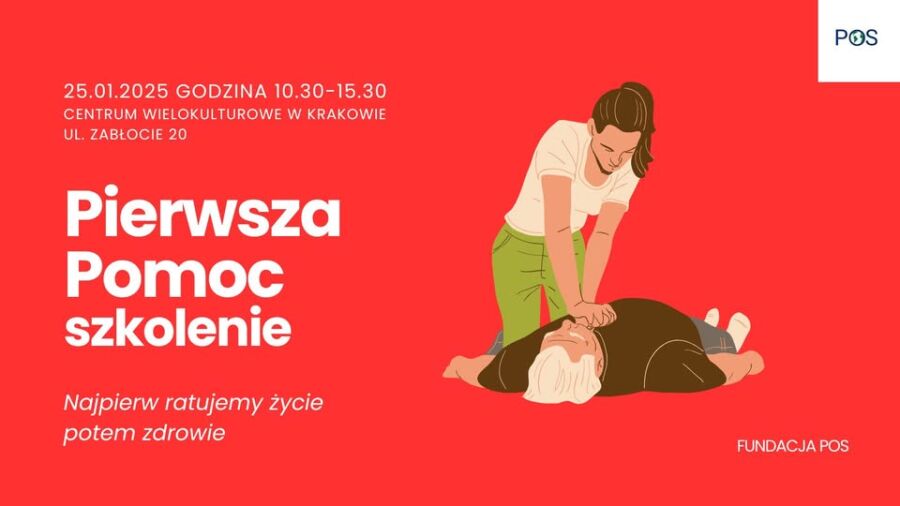 Fundacja POS Przy Okrągłym Stole zaprasza do zapisów na bezpłatne szkolenie dotyczące udzielania pierwszej pomocy. Wydarzenie odbędzie się 25 stycznia 2025 roku (sobota) w godzinach: 10:30 - 15:30. Miejsce szkolenia: Centrum Wielokulturowe w Krakowie, ul. Zabłocie 20, piętro 1.