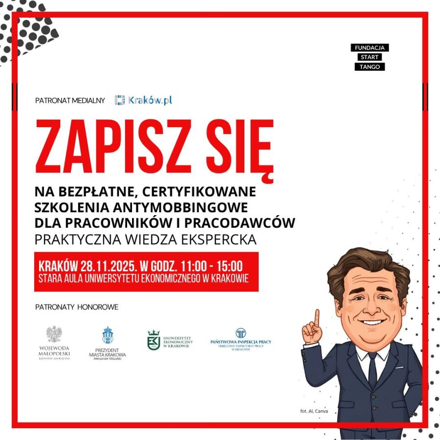 Fundacja Start Tango oraz Uniwersytet Ekonomiczny w Krakowie zapraszają Państwa na bezpłatne, certyfikowane szkolenia antymobbingowe skierowane do pracowników, pracodawców, kadry zarządzającej oraz wszystkich zainteresowanych mieszkańców woj. małopolskiego.