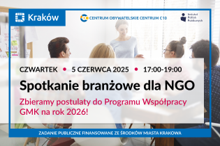 Fundacja Instytut Polityk Publicznych oraz Centrum Obywatelskie Centrum C 10 serdecznie zapraszają na spotkanie branżowe dla organizacji pozarządowych oraz osób zaangażowanych w działania trzeciego sektora w Krakowie.